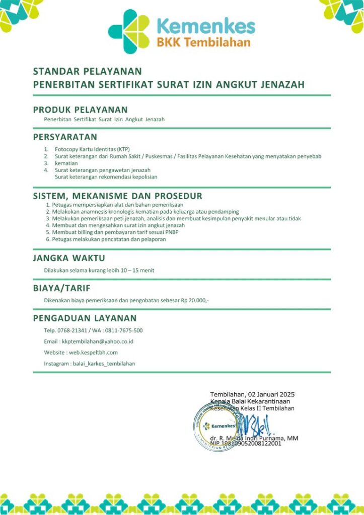 Standar Pelayanan Penerbitan Sertifikat Surat Izin Angkut Jenazah